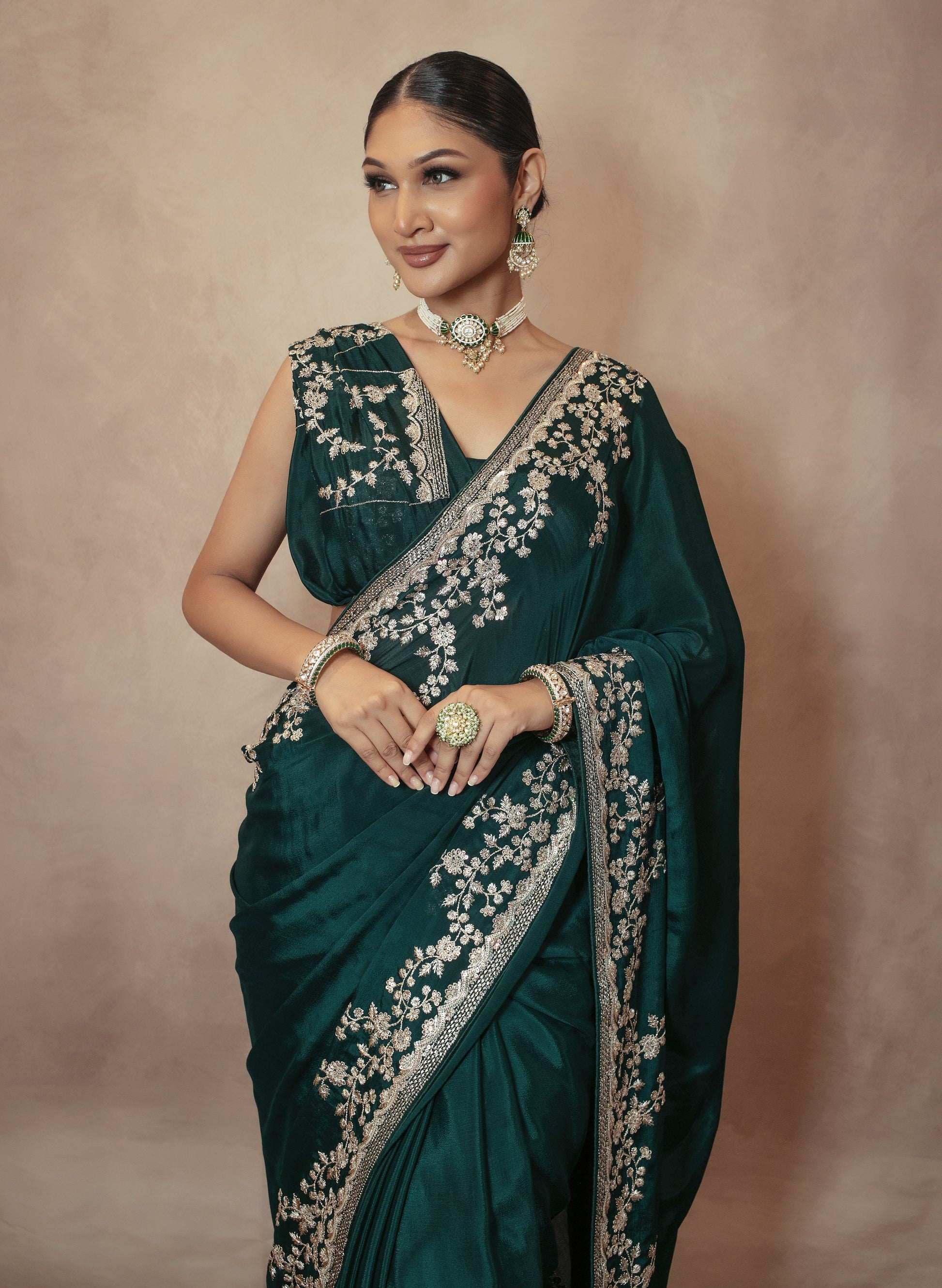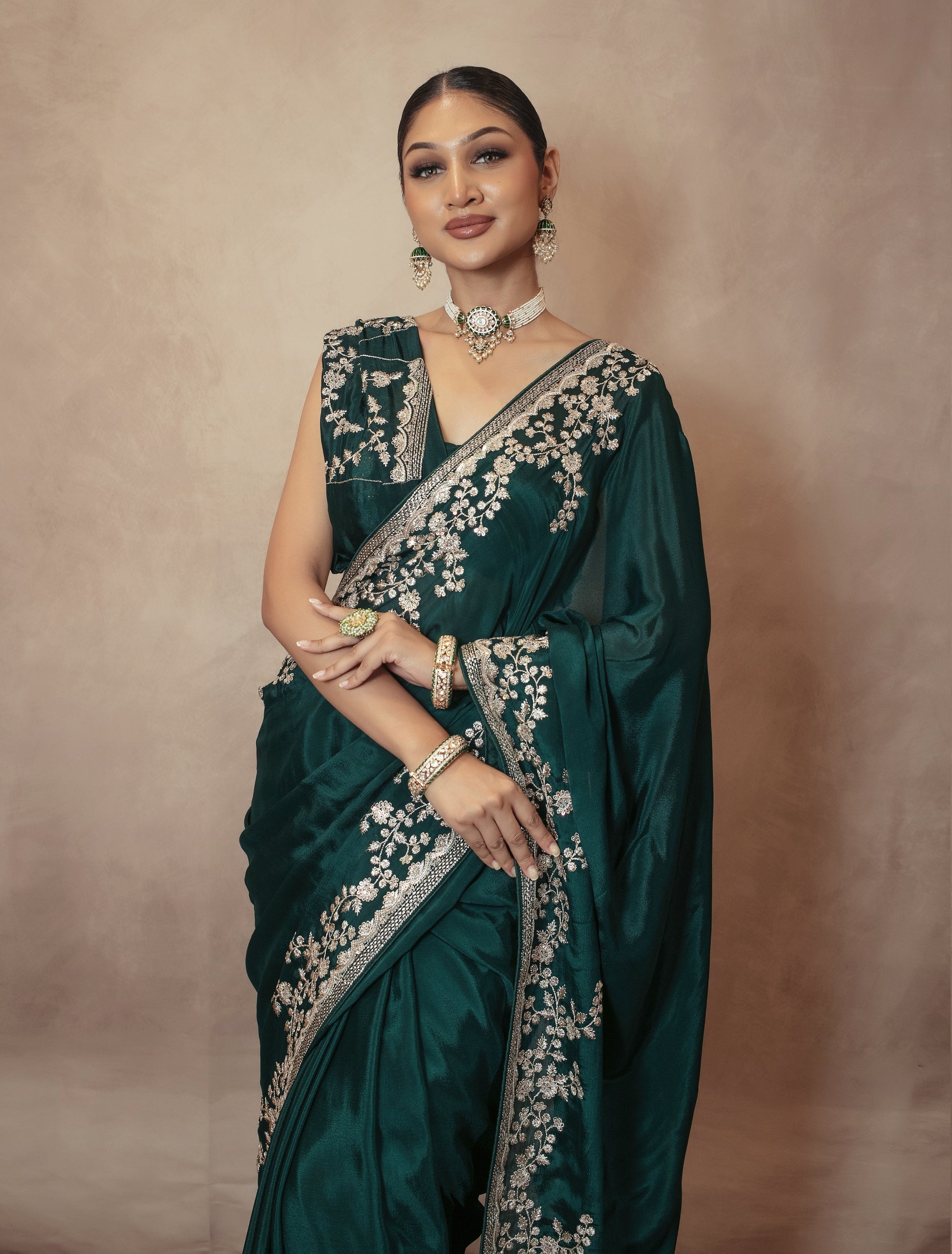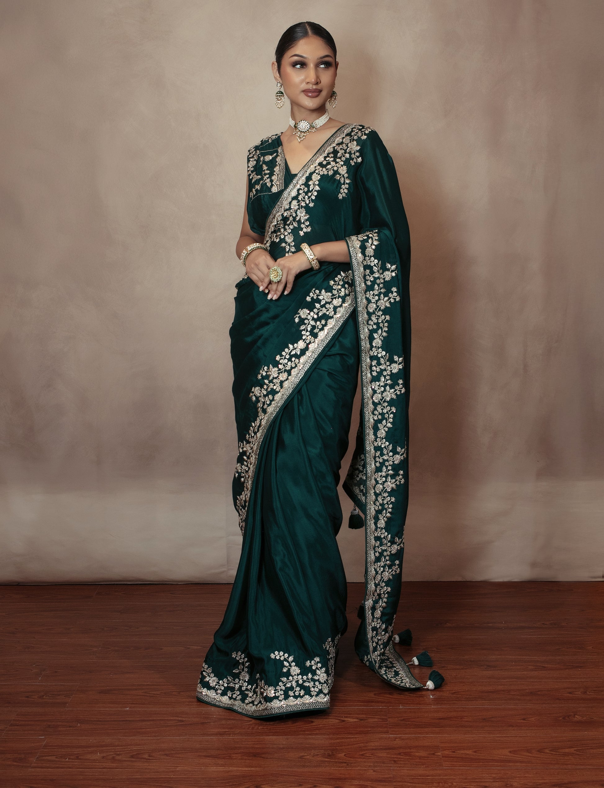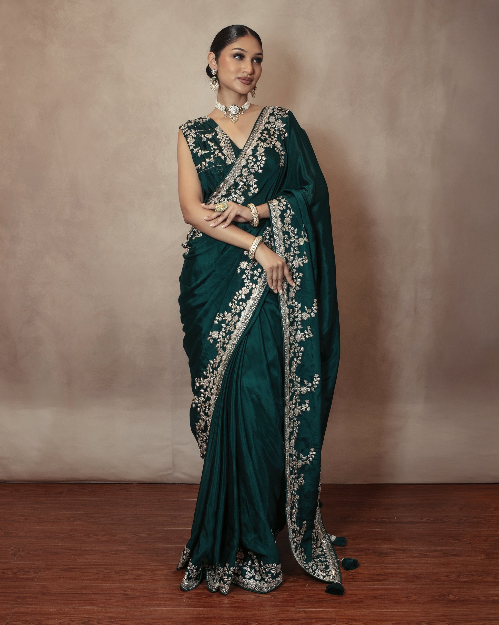 From our Premium Collection, this sari comes in a chamois silk fabric with threadwork embroidery and sequin embellishment.