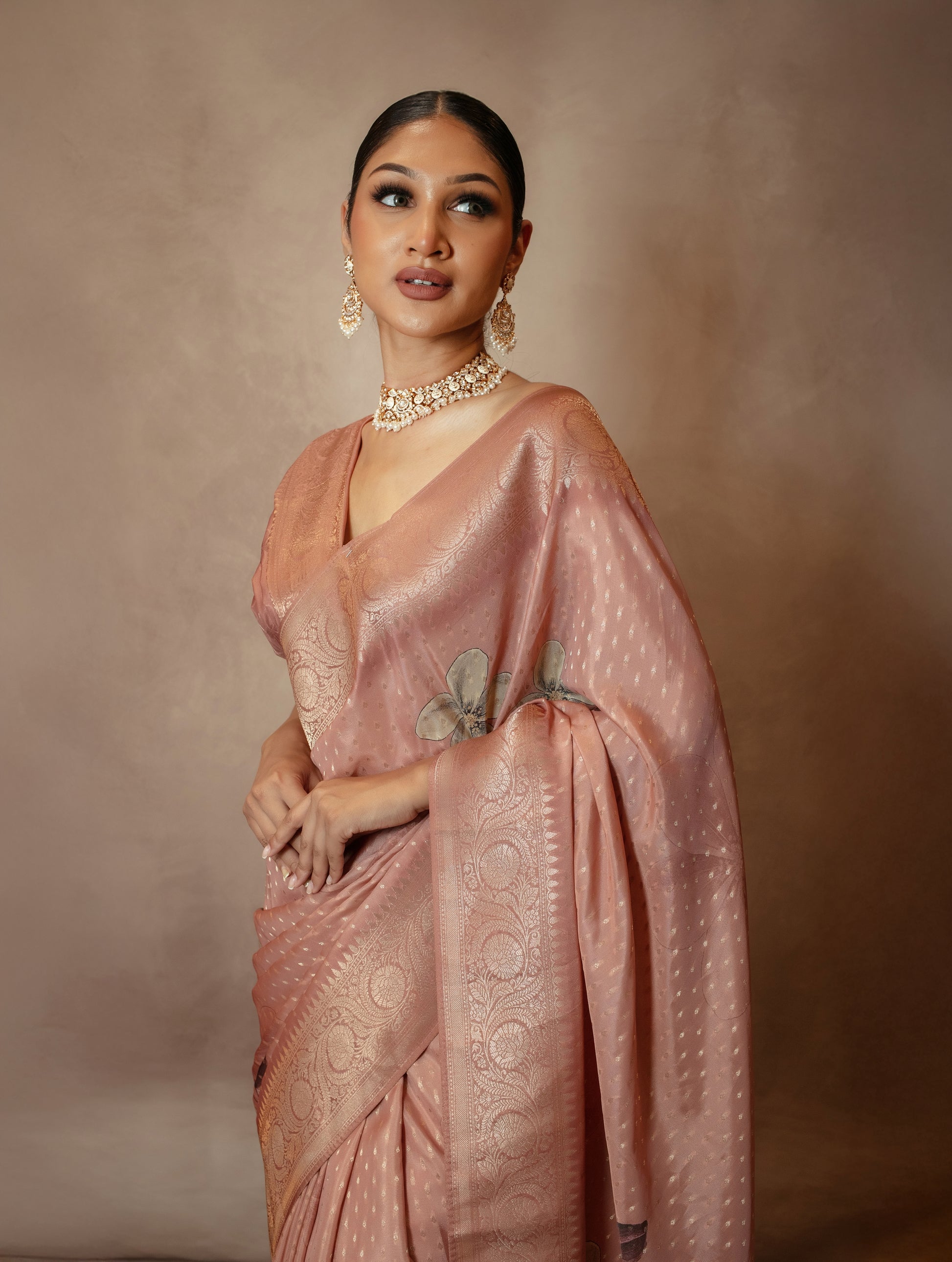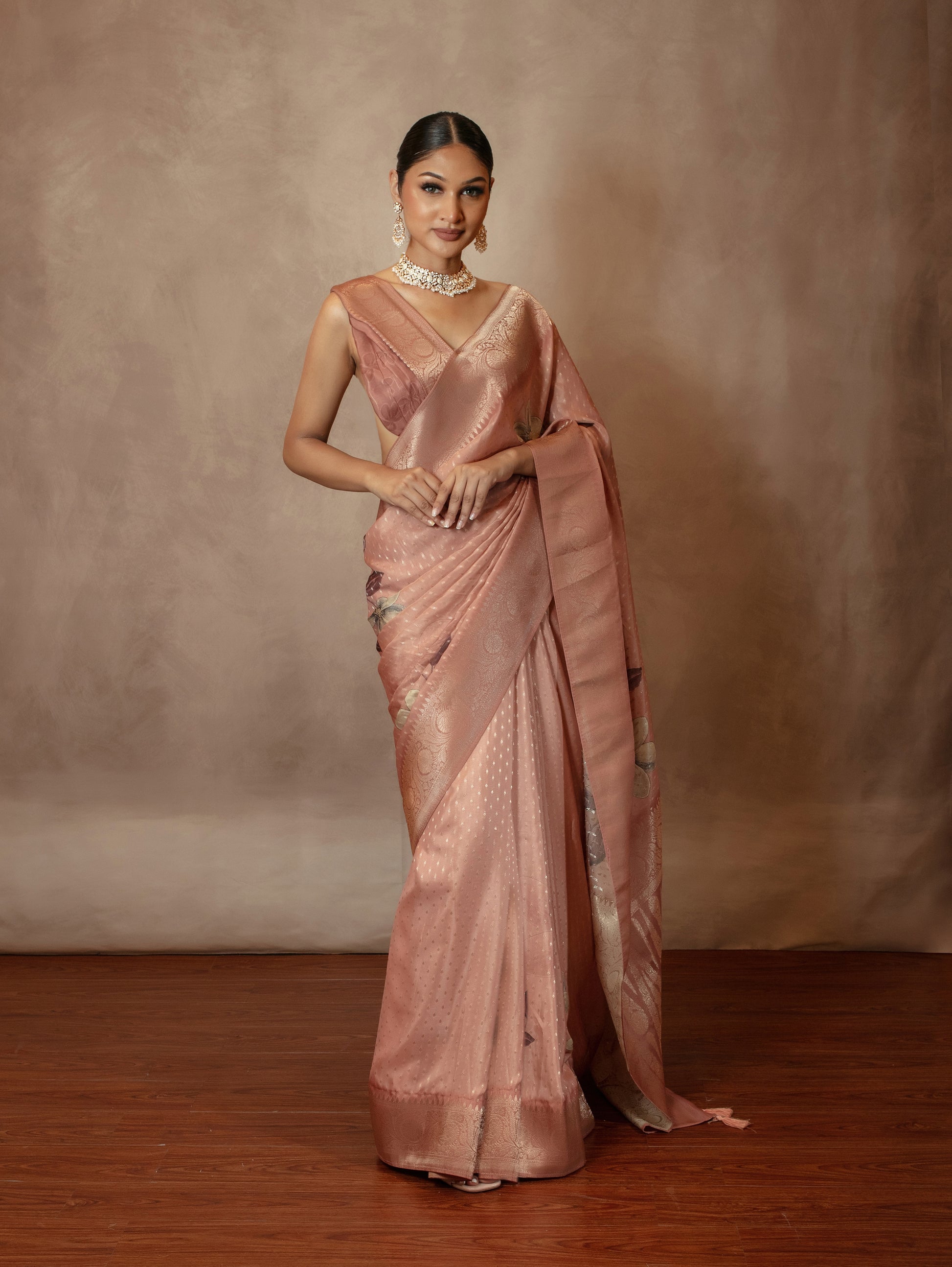 From our buy one get one free promotion of two saris for £99, an art crepe silk fabric with a digital floral print.